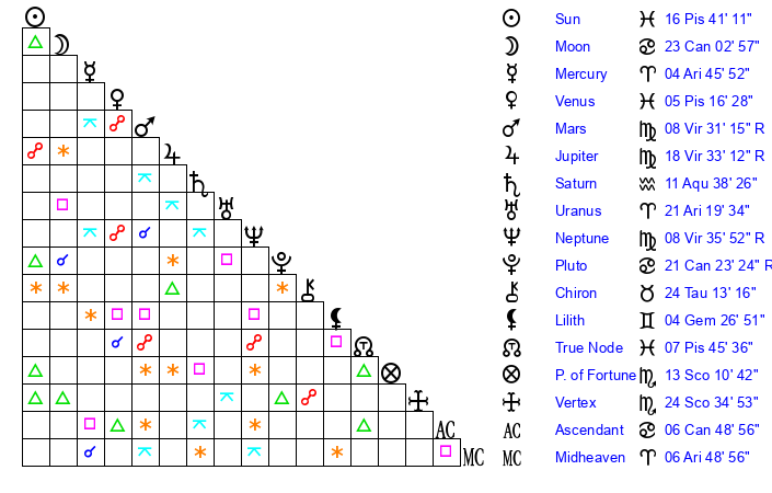 | Sun | 16 Pisces 41 | 17 Pisces 22 | 16 Gemini 28 |