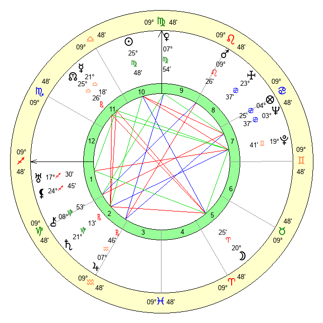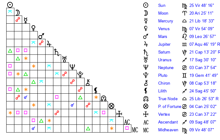 | Sun | 25 Virgo 48 | 27 Virgo 0 | 29 Capricorn 29 |