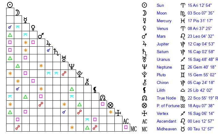 | Sun | 15 Aries 12 | 16 Aries 9 | 14 Leo 27 |