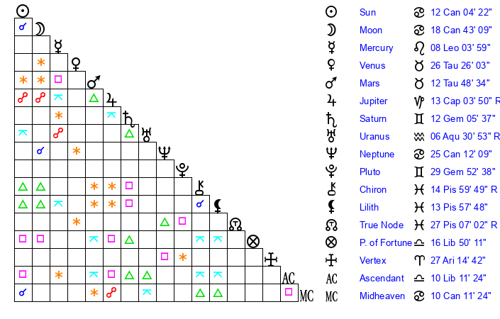 | Sun | 12 Cancer 4 | 12 Cancer 58 | 0 Scorpio 41 |