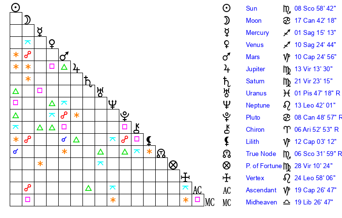 | Saturn | 22 Virgo 2 | 25 Pisces 39 | 24 Virgo 6 |