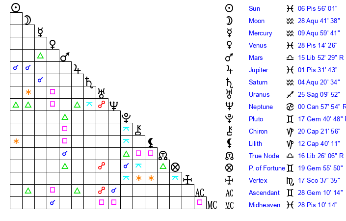 | Sun | 6 Pisces 56 | 8 Pisces 21 | 5 Cancer 48 |