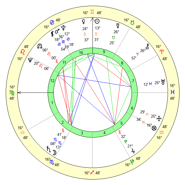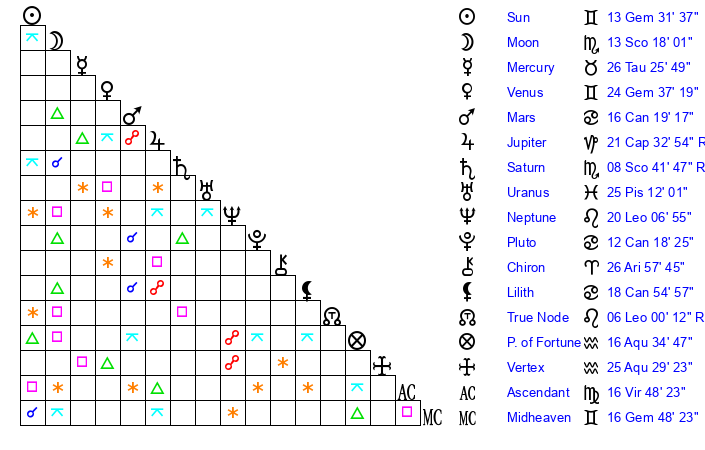 | Sun | 13 Gemini 32 | 14 Gemini 19 | 19 Virgo 24 |