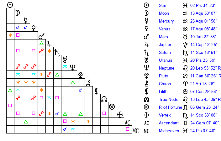 | Sun | 2 Pisces 34 | 3 Pisces 19 | 10 Gemini 39 |