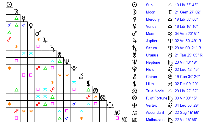 | Venus | 18 Libra 16 | 18 Virgo 38 | 5 Aquarius 28 |