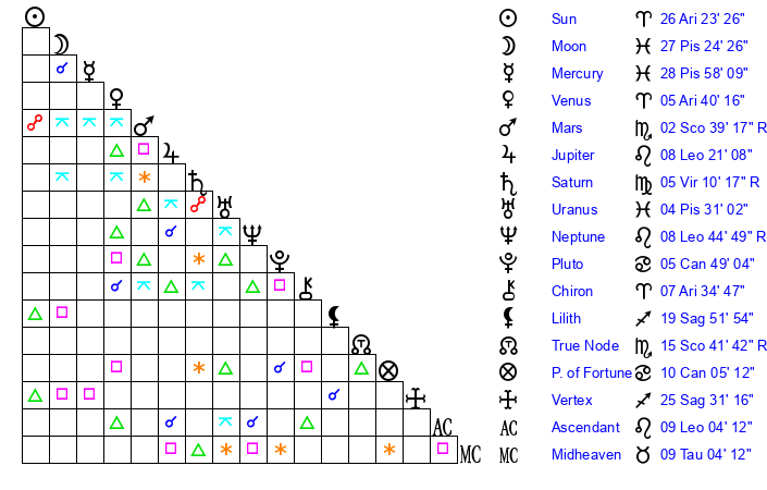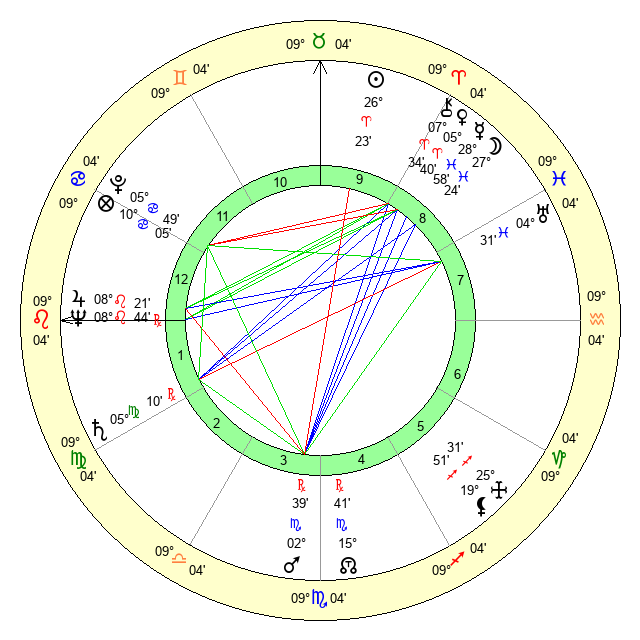 | Neptune | 8 Leo 44 | 0 Aries 37 | 11 Leo 6 |