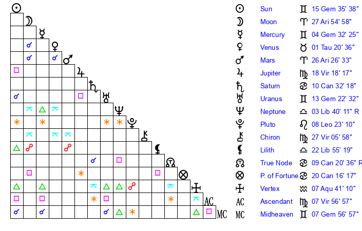 | Sun | 15 Gemini 36 | 16 Gemini 14 | 2 Virgo 6 |