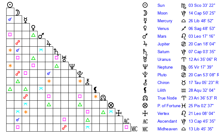 | Mercury | 26 Libra 49 | 28 Scorpio 9 | 15 Capricorn 2 |