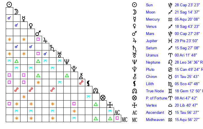 | Saturn | 15 Sagittarius 49 | 16 Pisces 5 | 18 Sagittarius 54 |