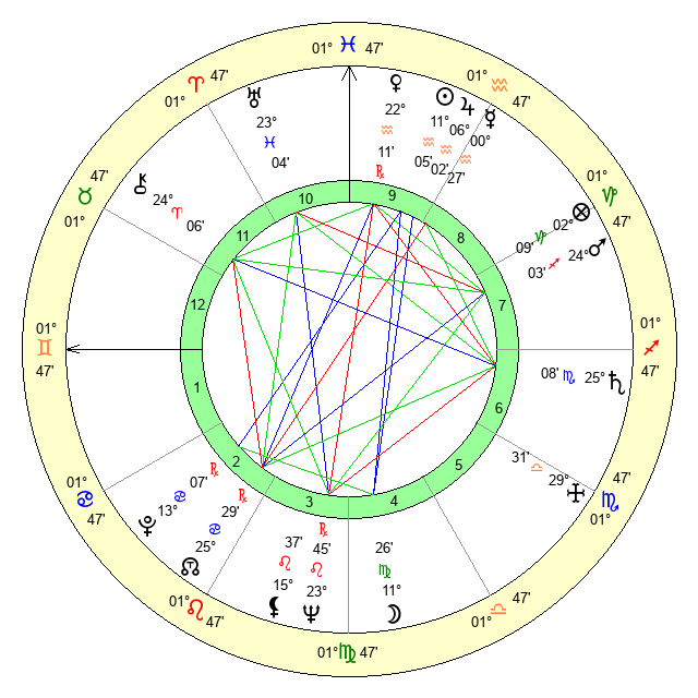| Moon | 11 Virgo 26 | 10 Pisces 40 | 3 Taurus 9 |