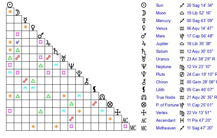| Venus | 6 Aquarius 14 | 14 Sagittarius 56 | 13 Aquarius 0 |