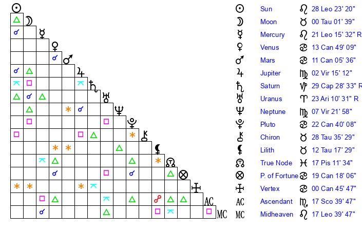 | Moon | 0 Taurus 2 | 9 Leo 47 | 17 Virgo 14 |