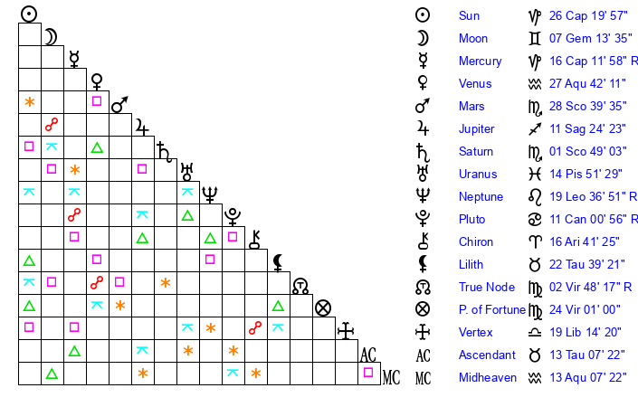 | Venus | 27 Aquarius 42 | 14 Pisces 48 | 22 Gemini 35 |