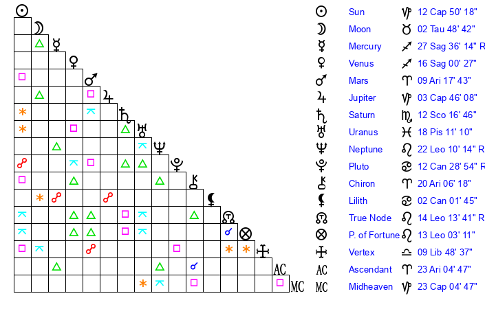 | Sun | 12 Capricorn 50 | 13 Capricorn 34 | 23 Aries 15 |