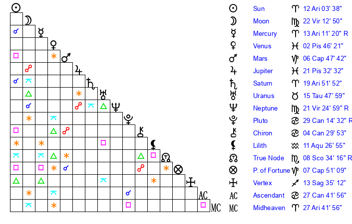 | Moon | 22 Virgo 20 | 12 Gemini 27 | 18 Scorpio 51 |