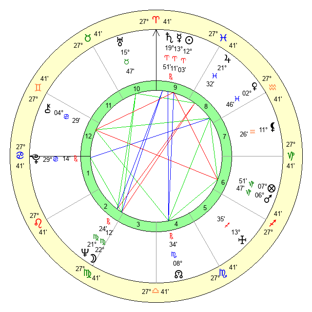 | Sun | 12 Aries 3 | 13 Aries 12 | 5 Cancer 8 |
