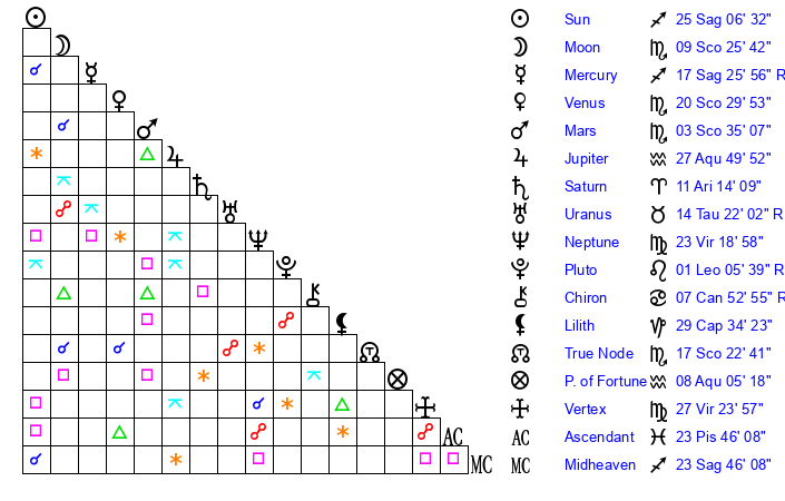| Sun | 25 Sagittarius 6 | 26 Sagittarius 0 | 23 Pisces 13 |