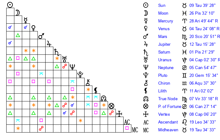 | Moon | 26 Pisces 27 | 21 Gemini 21 | 10 Leo 4 |