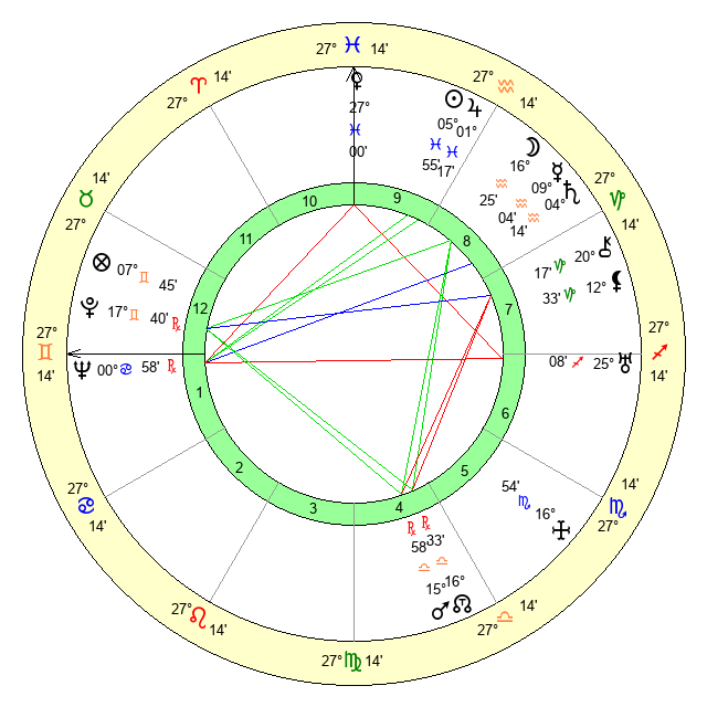 | Sun | 5 Pisces 56 | 7 Pisces 20 | 4 Cancer 50 |
