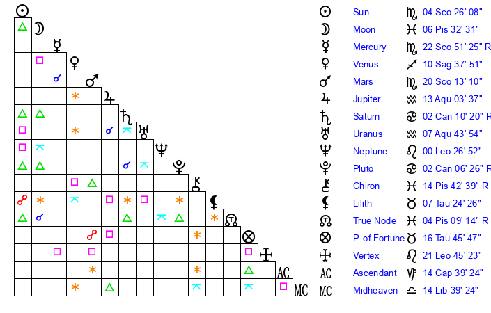 | Mercury | 22 Scorpio 51 | 29 Scorpio 13 | 6 Pisces 46 |