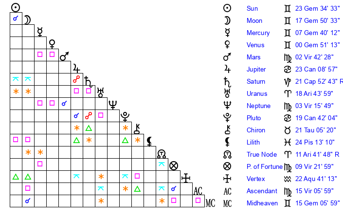 | Moon | 17 Gemini 54 | 15 Aquarius 38 | 8 Sagittarius 54 |