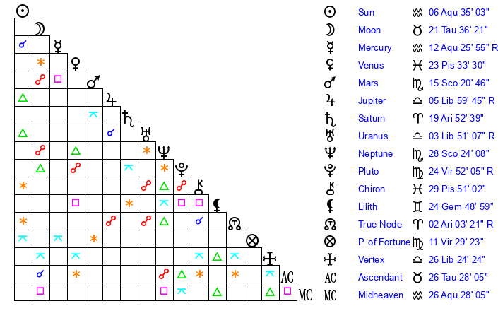 | Sun | 6 Aquarius 35 | 7 Aquarius 0 | 2 Aries 53 |