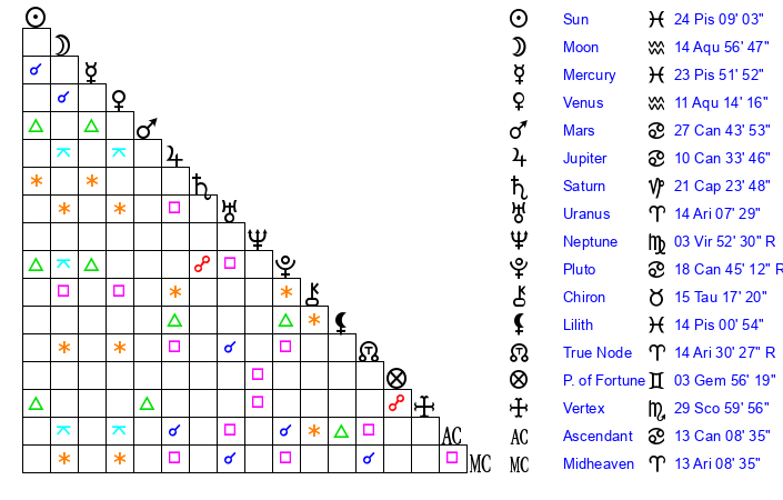 | Pluto | 18 Cancer 45 | 3 Aquarius 14 | 19 Cancer 45 |