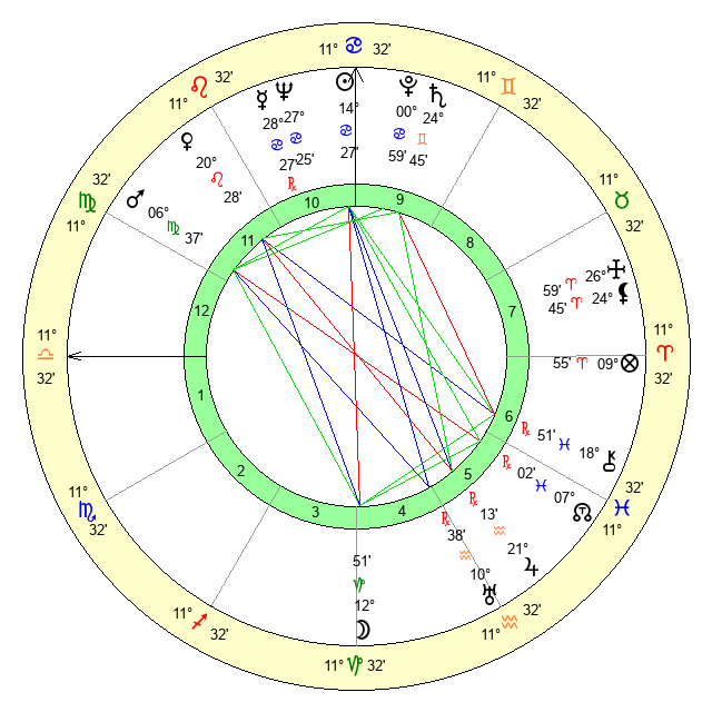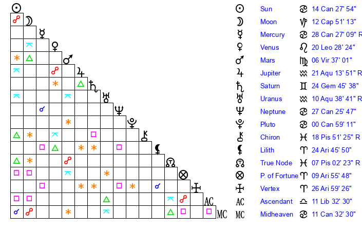 | Neptune | 27 Cancer 26 | 2 Aries 10 | 0 Leo 27 |