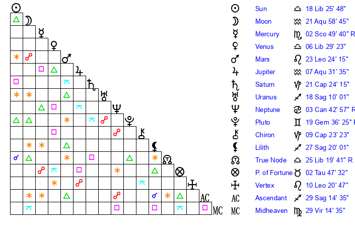 | Sun | 18 Libra 25 | 19 Libra 37 | 22 Aquarius 49 |