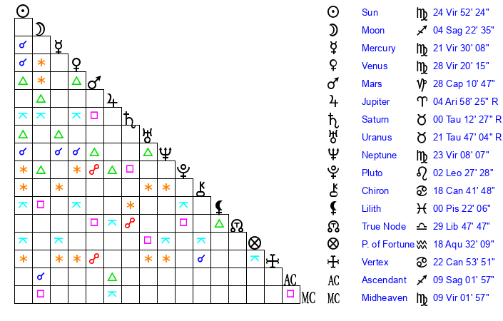 | Sun | 24 Virgo 52 | 26 Virgo 2 | 20 Sagittarius 47 |