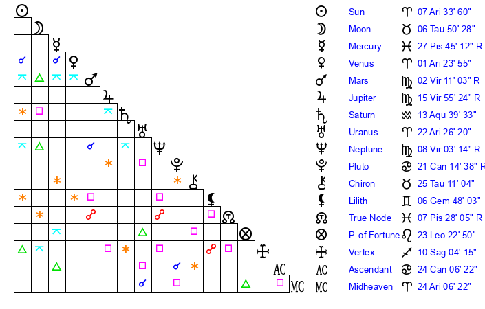 | Sun | 7 Aries 34 | 8 Aries 16 | 6 Cancer 31 |