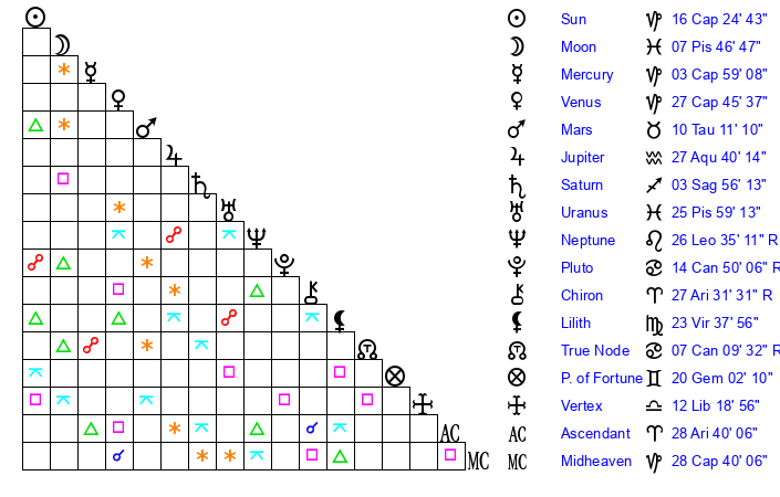 | Moon | 7 Pisces 39 | 27 Aries 1 | 8 Libra 55 |