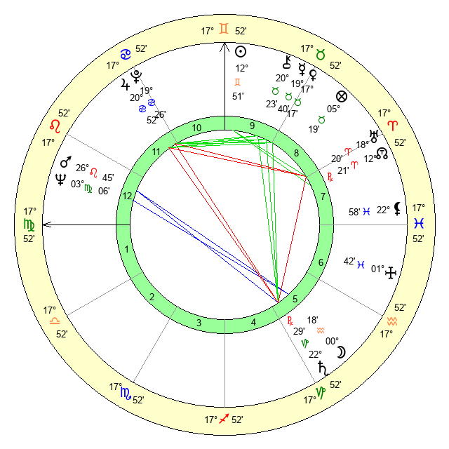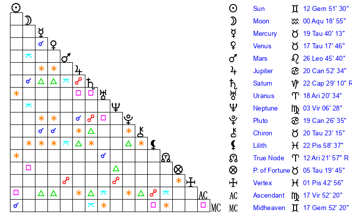 | Sun | 12 Gemini 51 | 14 Gemini 5 | 12 Virgo 53 |