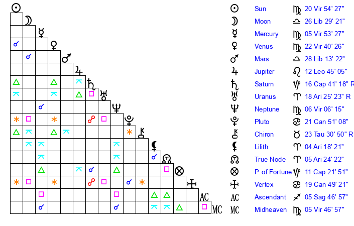 | Sun | 20 Virgo 54 | 22 Virgo 8 | 24 Sagittarius 48 |