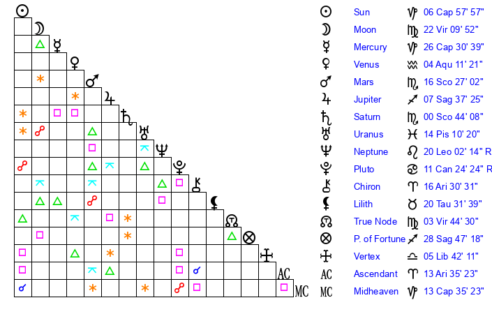 | Mars | 16 Scorpio 27 | 10 Capricorn 56 | 21 Capricorn 4 |