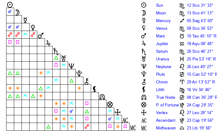 | Sun | 12 Scorpio 32 | 13 Scorpio 32 | 23 Aquarius 0 |