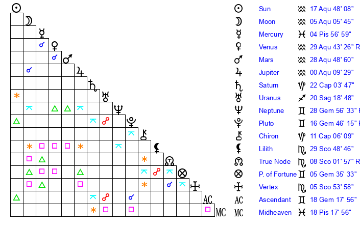 Sun | 17 Aquarius 48 | 18 Aquarius 58 | 18 Gemini 39 |