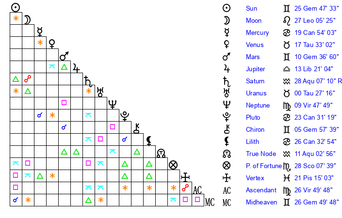| Sun | 25 Gemini 47 | 26 Gemini 45 | 23 Virgo 7 |