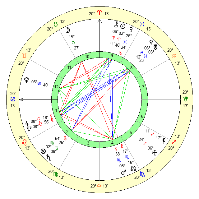 | Sun | 2 Aries 46 | 3 Aries 19 | 14 Cancer 16 |