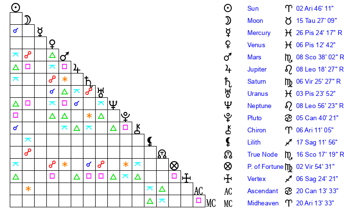 | Sun | 2 Aries 46 | 3 Aries 19 | 14 Cancer 16 |