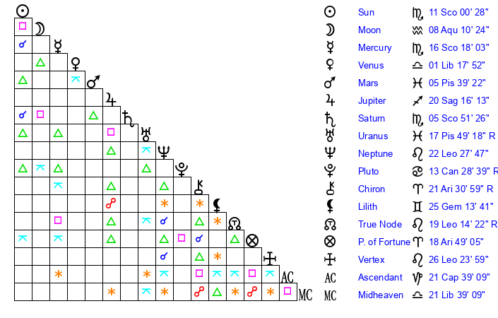 | Saturn | 6 Scorpio 23 | 25 Pisces 34 | 14 Scorpio 47 |