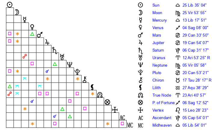 | Sun | 25 Libra 35 | 26 Libra 34 | 1 Aquarius 43 |