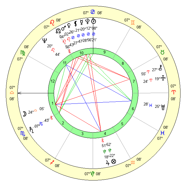 | Moon | 23 Libra 57 | 15 Virgo 36 | 3 Cancer 22 |
