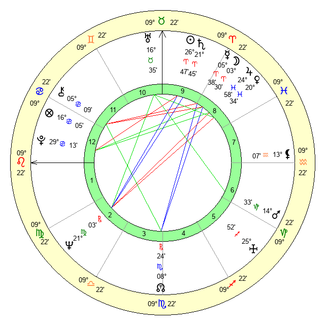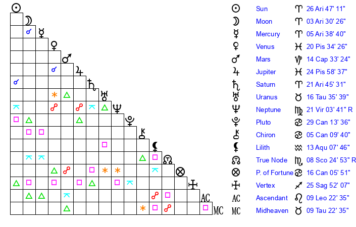 | Moon | 3 Aries 30 | 19 Sagittarius 7 | 23 Taurus 29 |