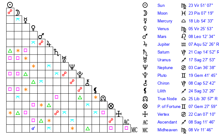 | Sun | 23 Virgo 51 | 25 Virgo 3 | 27 Capricorn 27 |