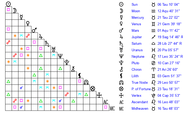 | Sun | 6 Taurus 10 | 6 Taurus 43 | 12 Leo 57 |
