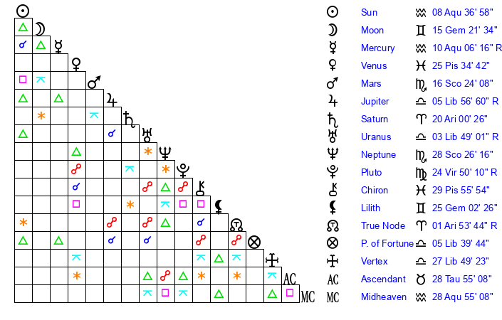 | Saturn | 20 Aries 12 | 17 Pisces 0 | 25 Aries 45 |