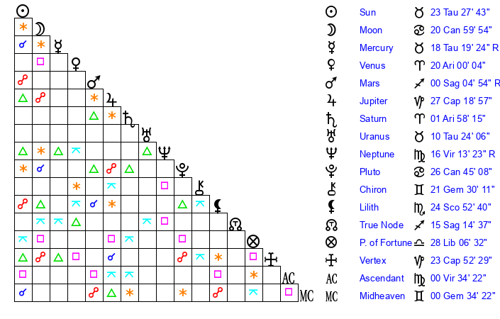 | Sun | 23 Taurus 27 | 24 Taurus 9 | 17 Leo 37 |