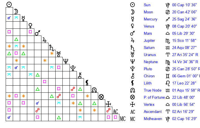 | Sun | 0 Capricorn 10 | 1 Capricorn 21 | 1 Aries 8 |