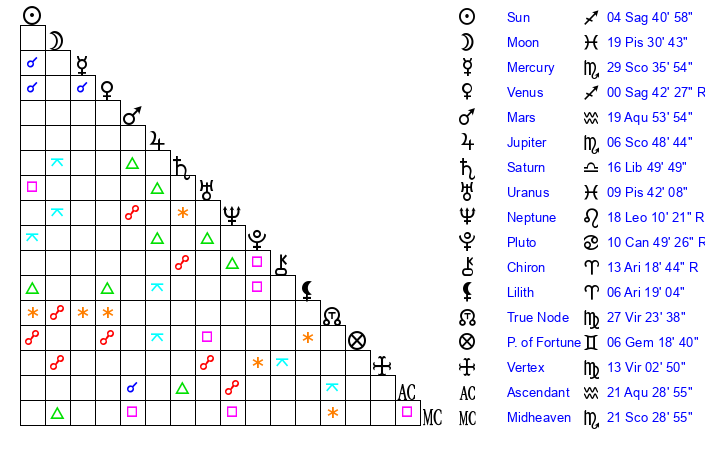 | Mercury | 29 Scorpio 36 | 21 Scorpio 4 | 26 Aquarius 26 |